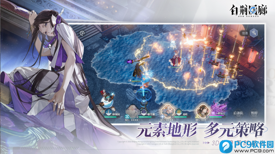 即时策略塔防战斗:六边形方格部署角色,保护终端,兼具即时操作与塔防策略;炎 / 水 / 雷 / 霜四属性互反应,风 / 蚀 / 物理各有机制,技能手动释放,战场决策空间大。